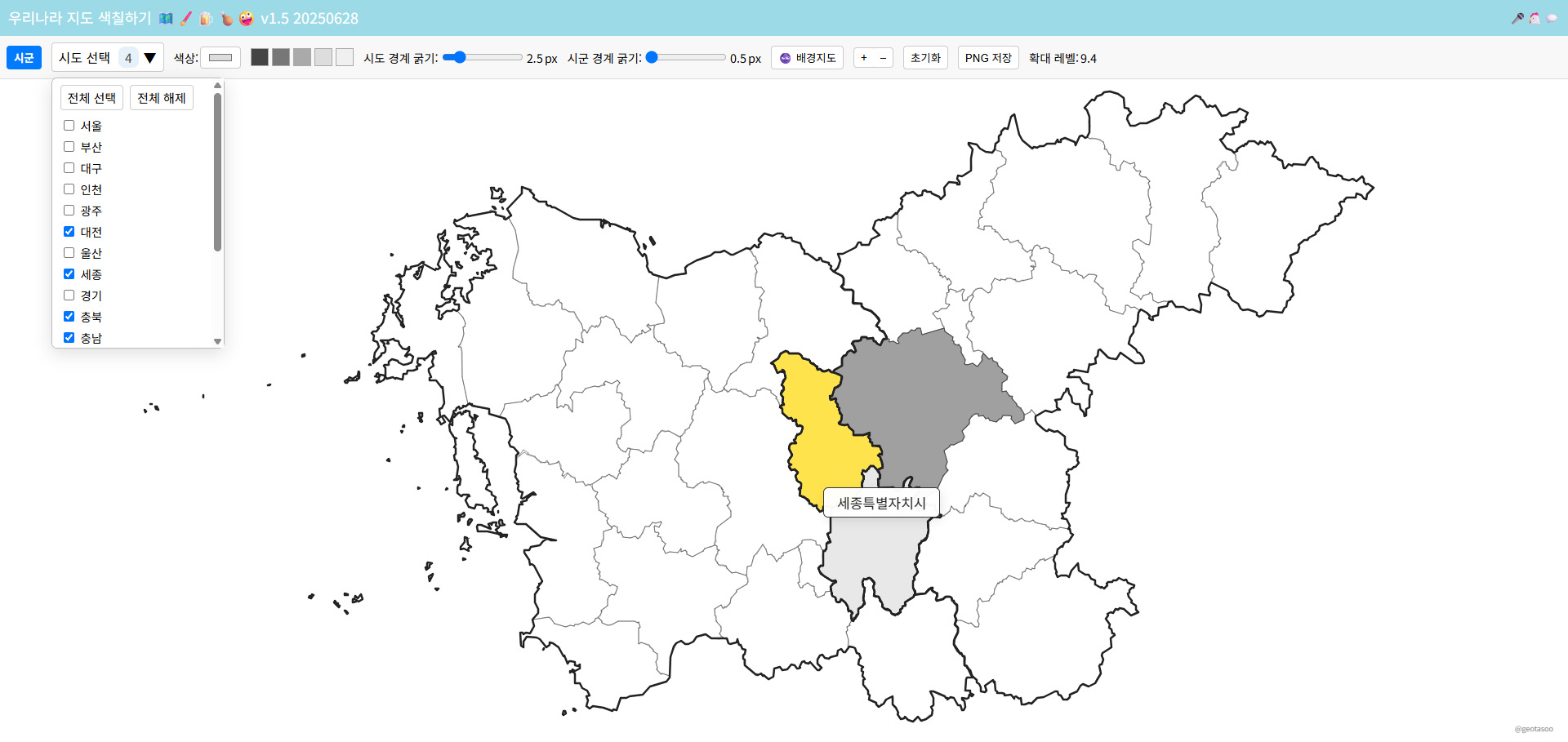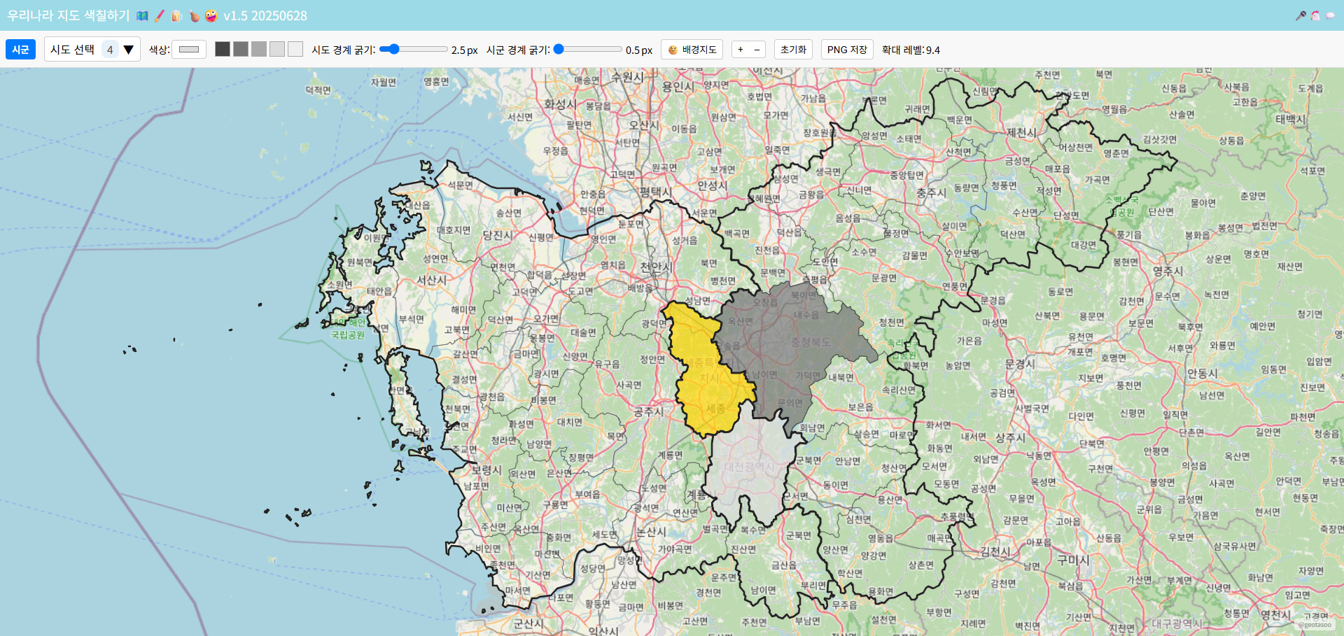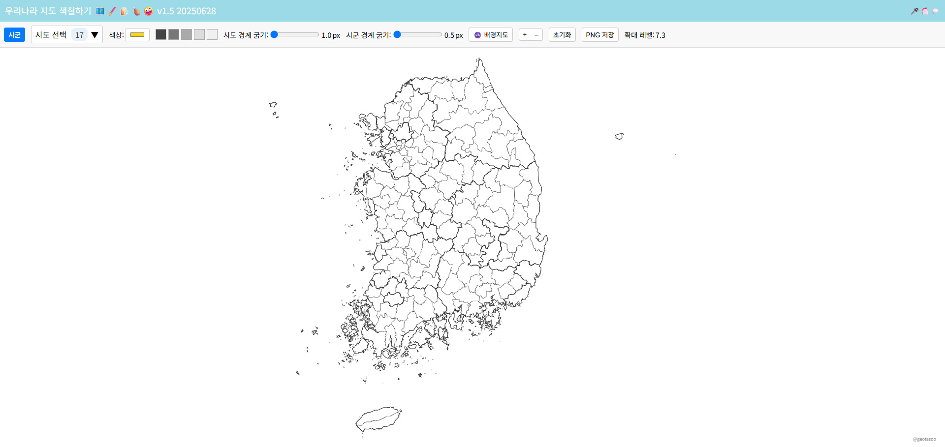 이왕 이렇게 된 거. 우리나라 지도 색칠하기도 만들었습니다. 역시 gpt의 도움을 받아 만들었습니다. 설마? 되나? 하면서 gpt와 대화하다보니 하나 둘씩 되네요. 신기하고 즐거운 경험이었습니다.